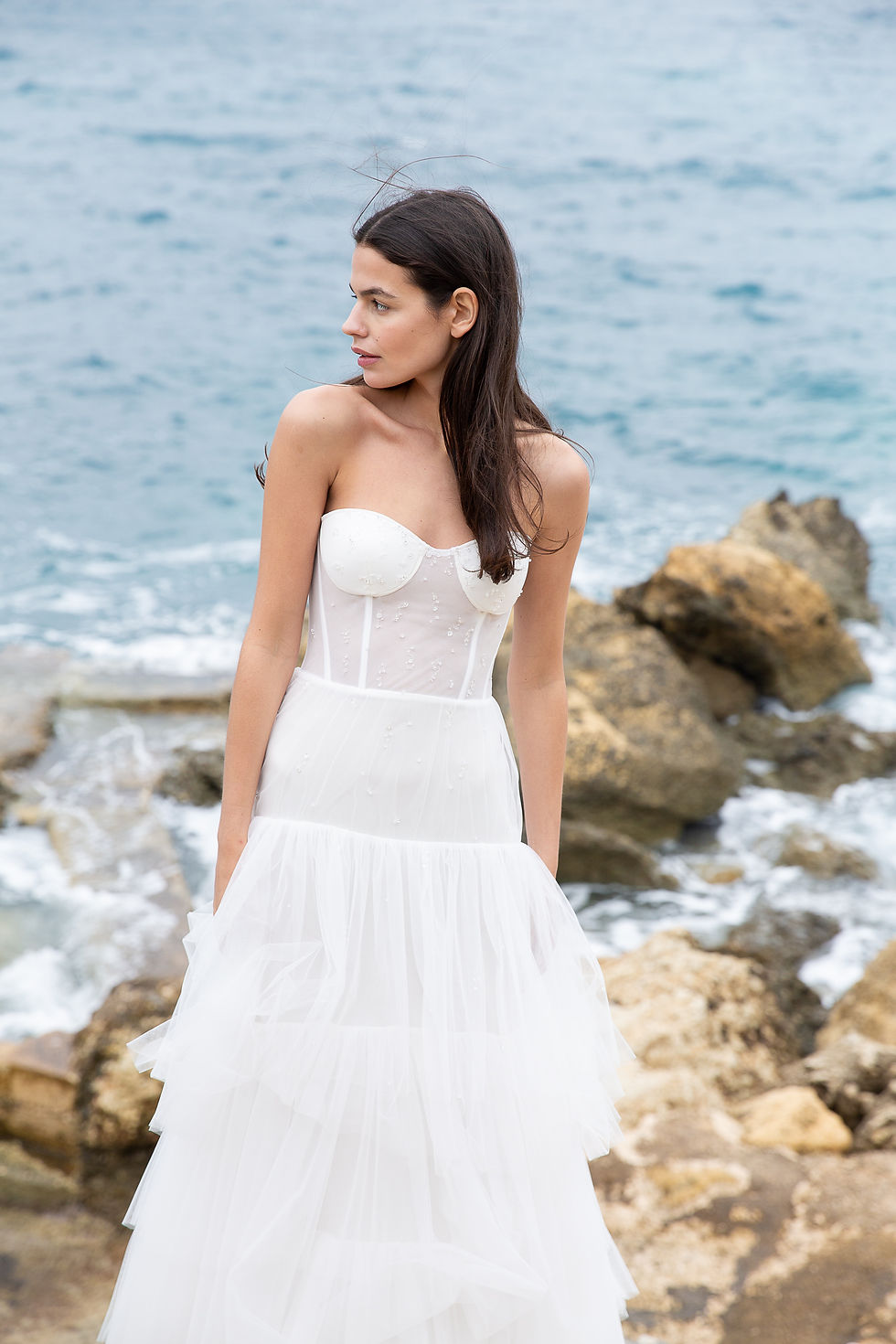 White tulle ball gown featuring a glamour corset top and a skirt made of layered tulle, embellished with hand-embroidered glass beads and crystals.