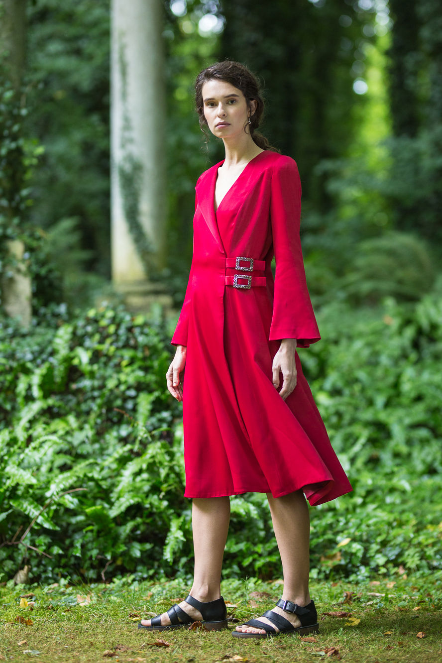Structured wrap dress crafted from a cherry red crepe-satin. An asymmetric collar cut in bell sleeves falls into a subtly flared hem. The buckles are custom made.